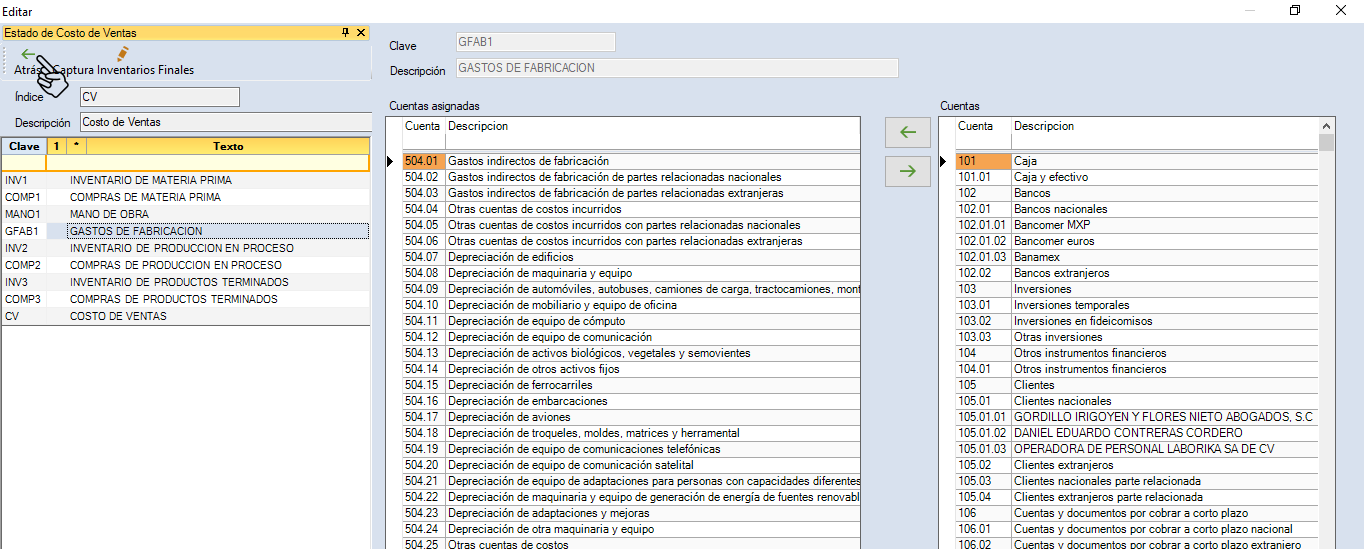 Al dar clic en "Asignar" te mostrará la ventana para configurar cada uno de los elementos del costo de ventas.