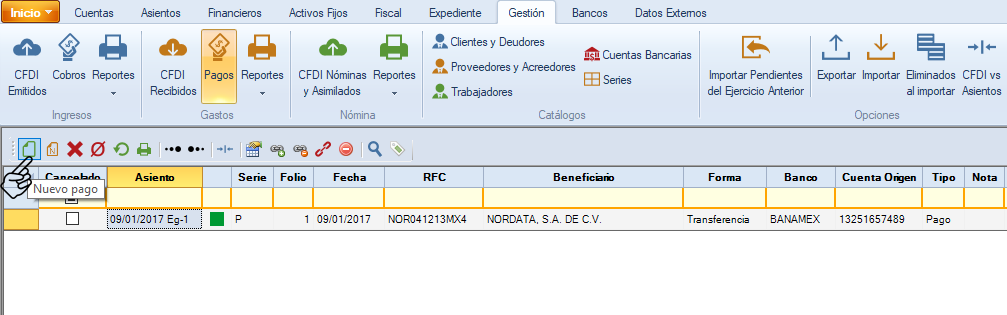 Te mostrará la ventana de "Nuevo Pago". Indica la fecha de la comprobación del gasto, selecciona "Comprobación de gastos". Da clic en "Pendientes" y selecciona el ingreso a comprobar correspondiente.
