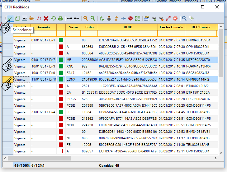 Agrega las facturas con las que realizarás la comprobación del gasto, con el botón "Adicionar". Te mostrará la siguiente ventana. Selecciona la factura o facturas y da clic en "Seleccionar".