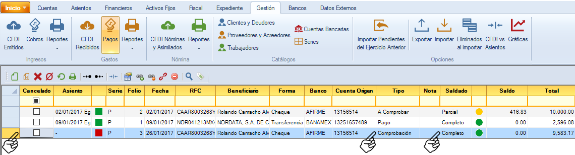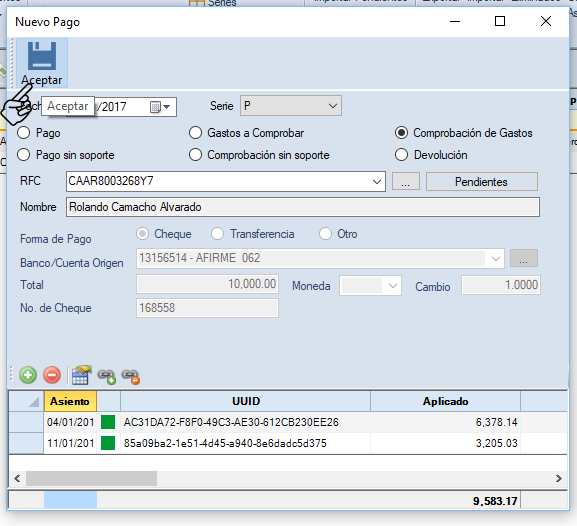 En este ejemplo solo se comprobaron 9,583.17 de un total de 10,000.00. Se deberá realizar otra comprobación cuando se tenga el complemento o una comprobación sin soporte.