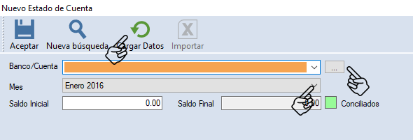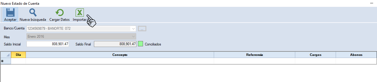 Te permitirá importar desde Excel la información o capturarla manualmente. Selecciona la cuenta bancaria, coloca el saldo inicial y elige el mes del estado de cuenta. Da clic en "Cargar Datos".