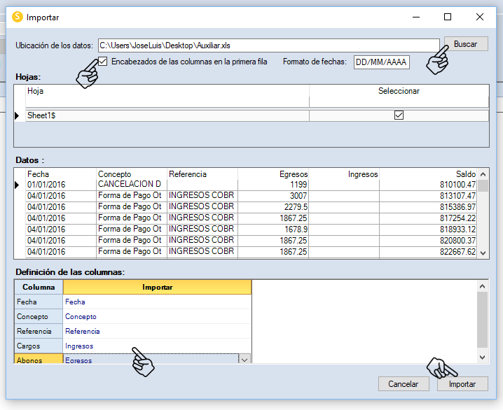Te mostrará una ventana donde deberás indicar la ruta donde se encuentra el archivo correspondiente. En caso de tener títulos las columnas, habilita la opción “Encabezado de las columnas en la primera fila”, indica también el formato de fecha de acuerdo a formato del estado de cuenta, si tienes varias hojas en el libro de Excel, selecciona la correspondiente y por último en “Definición de columnas” relaciona las columnas de la hoja de cálculo contra los nombres de las columnas “Columna” al terminar la configuración da clic en “Importar”: