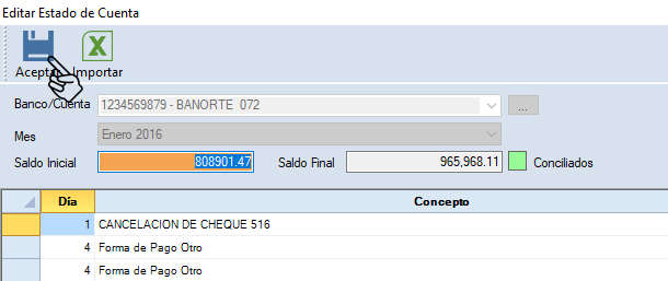 Al terminar de importar da clic en "Proceso terminado". Para finalizar da clic en "Aceptar" y se guarde la información del estado de cuenta bancario.